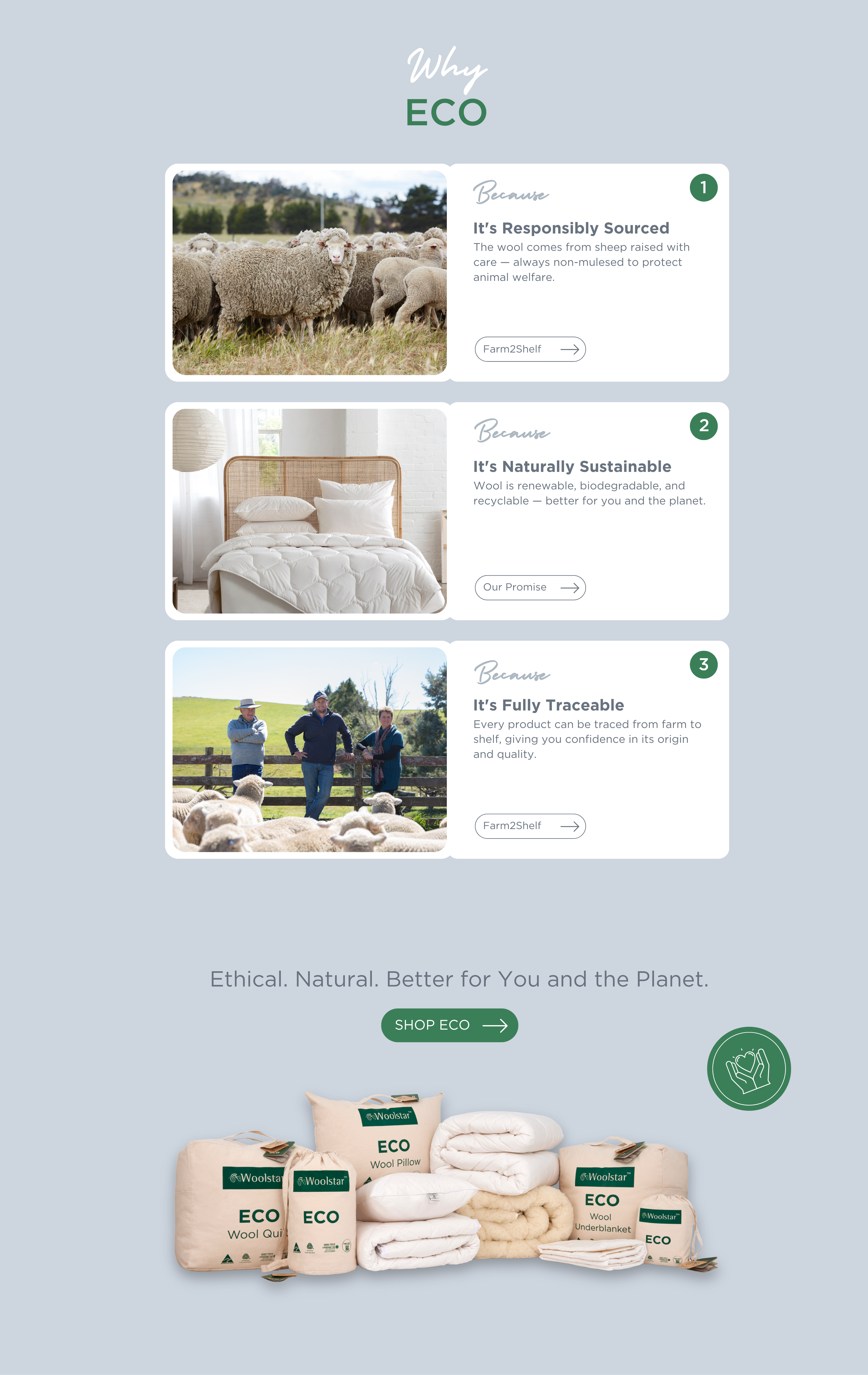 Explore our eco-friendly quilts, pillows, and mattress toppers - and don’t forget, every Woolstar product is traceable back to the farm it came from using our Farm2Shelf tracing tool.