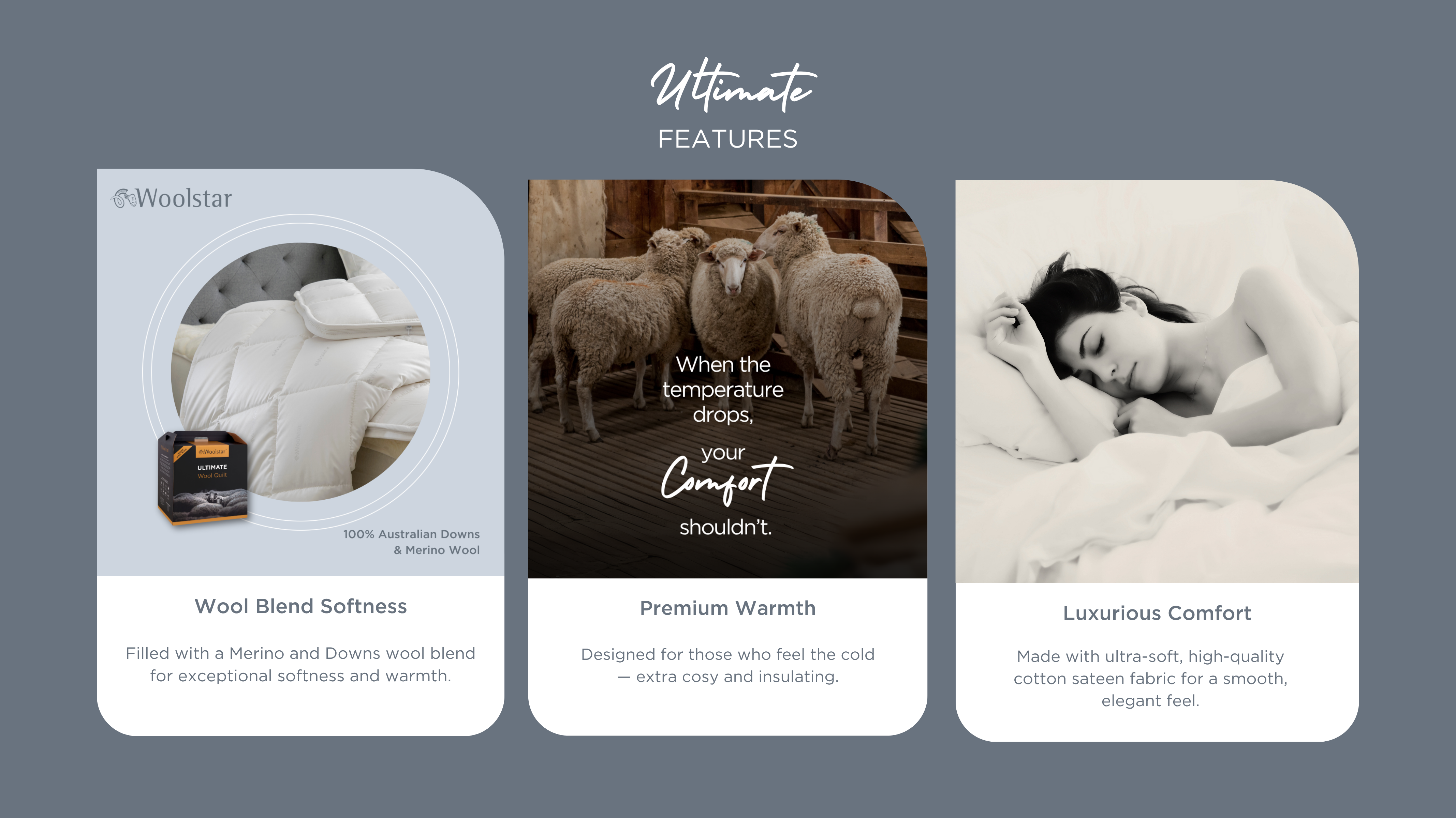The Woolstar Ultimate Quilt is exactly the same as the name suggests; the ULTIMATE of quilts. Perfect for those who feel the cold and want the ultimate in bedding products, this quilt is suitable for cold winter nights with 550gsm of wool filling without weighing you down while you sleep. The Woolstar Ultimate Wool quilt is designed to provide optimum durability and even temperature while you sleep. The Quilt features diamond quilting to prevent uneven clumping of fill and to maintain a smooth appearance. Australian Downs wool mixed with ultra fine Merino wool is highly durable and can be machine washed and tumble dried whilst maintaining shape and loft.